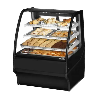 Serve with pride with the True Manufacturing TDM-DC-36-GE/GE-S-S Display Case, Non-Refrigerated Bakery. This top-of-the-line display merchandiser is perfect for showcasing your delectable baked goods in a commercial restaurant setting. With its curved glass front and glass sides, customers will be enticed by the mouthwatering treats on display. The two rear sliding glass doors make it easy for staff to access and restock the shelves, ensuring a seamless customer experience. The three tiered levels of adjustable chrome plated wire shelves provide ample space to showcase a variety of baked goods, from pastries to breads. The LED interior lighting illuminates the products, making them even more enticing to customers. Made in the USA with a stainless steel exterior and interior, this display case is not only durable but also easy to clean. With its CE, cULus, and UL EPH Classified certifications, you can trust in the quality and safety of this True Manufacturing display case. Elevate your bakery display and attract customers with the True Manufacturing TDM-DC-36-GE/GE-S-S Display Case, Non-Refrigerated Bakery.