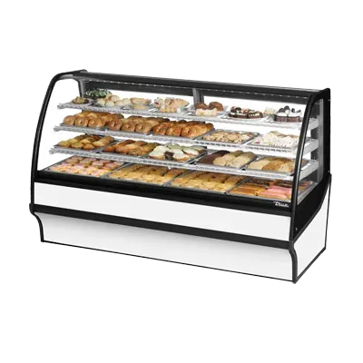 Ignite culinary passion with the True Manufacturing TDM-DC-77-GE/GE-S-W Display Case, Non-Refrigerated Bakery. This top-of-the-line display merchandiser is perfect for showcasing your delectable baked goods in a commercial restaurant setting. With its curved glass front and glass sides, customers will be enticed by the mouthwatering treats on display. The two rear sliding glass doors make it easy for staff to access and restock the shelves, ensuring a seamless customer experience. The three tiered levels of adjustable white PVC coated wire shelves provide ample space to showcase a variety of pastries, breads, and desserts. The LED interior lighting illuminates your products, making them even more enticing to customers. Made in the USA with a stainless steel exterior and white powder coated interior, this display case is not only durable but also easy to clean. Trust True Manufacturing to deliver a high-quality, reliable display case that will elevate your bakery to new heights.
