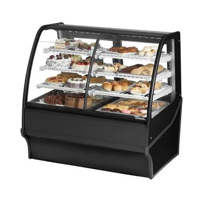 Experience kitchen innovation with the True Manufacturing TDM-DZ-48-GE/GE-B-W Display Case. This dual-zone merchandiser is perfect for commercial restaurants looking to showcase their products in style. The two rear sliding glass doors provide easy access for restocking and cleaning. The three tiered levels of adjustable white PVC coated wire shelves allow for flexible display options, accommodating a variety of products. The LED interior lighting illuminates your merchandise, making it even more enticing to customers. The black powder coated exterior and white powder coated interior give this display case a sleek and professional look. With its self-contained refrigeration system and R290 Hydrocarbon refrigerant, this display case is energy efficient and environmentally friendly. Trust True Manufacturing, a leader in commercial refrigeration, and elevate your restaurant's display game with the TDM-DZ-48-GE/GE-B-W Display Case.