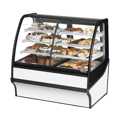 Invest in superior quality with the True Manufacturing TDM-DZ-48-GE/GE-S-W Display Case. This dual-zone merchandiser is perfect for commercial restaurant use, offering both dry and refrigerated storage options. With a spacious 48-1/4" width and a curved glass front, this display case is designed to showcase your products in an attractive and enticing way. The glass sides and rear sliding glass doors provide easy access and visibility for customers. The three tiered levels of adjustable white PVC coated wire shelves offer ample space for displaying a variety of items. The LED interior lighting illuminates your products, making them even more appealing. Made in the USA with a stainless steel exterior and a white powder coated interior, this display case is not only durable but also easy to clean. With its R290 Hydrocarbon refrigerant and 1/4 HP compressor, this display case is energy efficient and environmentally friendly. Invest in the True Manufacturing TDM-DZ-48-GE/GE-S-W Display Case and elevate your restaurant's merchandising game.