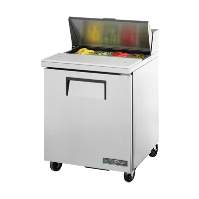 Fuel your restaurant's success with the True Manufacturing TSSU-27-08-HC Refrigerated Counter, Sandwich / Salad Unit. This top-of-the-line unit is designed to meet the demanding needs of a commercial restaurant. With its stainless steel insulated cover and aluminum interior with a stainless steel floor, this unit ensures durability and easy cleaning. The sandwich/salad unit comes with eight 1/6 size poly pans, allowing you to store a variety of ingredients for your sandwiches and salads. The 11-3/4" cutting board provides ample space for food preparation, while the aluminum back and front add to the unit's sleek appearance. Equipped with a door and two shelves, this unit offers convenient storage options. The 5" castors make it easy to move the unit around your kitchen. With its energy-efficient R290 Hydrocarbon refrigerant and 1/5 HP compressor, this unit not only keeps your ingredients fresh but also helps reduce energy costs. Trust True Manufacturing for quality and reliability.