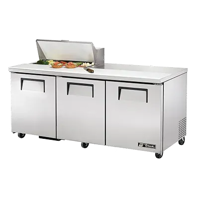 Equip your commercial kitchen with the True Manufacturing TSSU-72-08-HC Refrigerated Counter, Sandwich / Salad Unit. This top-of-the-line unit is designed to meet the demands of a busy restaurant environment. With its stainless steel top, front, and sides, as well as an aluminum back, this unit is built to withstand the rigors of daily use. The TSSU-72-08-HC features three full doors and six shelves, providing ample storage space for all your sandwich and salad ingredients. The unit also comes with eight 1/6 size poly pans, perfect for organizing and storing your toppings. The stainless steel insulated cover and 11-3/4" cutting board ensure that your ingredients stay fresh and ready to use. With its 5" castors, the unit is easy to move and clean around. Made in the USA and UL EPH Classified, the True Manufacturing TSSU-72-08-HC is a reliable and efficient addition to any commercial kitchen.