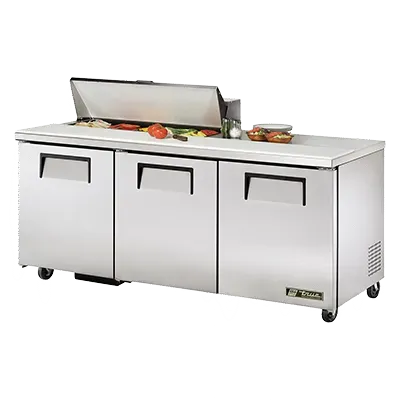 Take your kitchen to the next level with the True Manufacturing TSSU-72-10-HC Refrigerated Counter, Sandwich / Salad Unit. This top-of-the-line unit is designed to meet the demands of a busy commercial restaurant. With its stainless steel insulated cover and 11-3/4"D cutting board, you can easily prepare and assemble sandwiches and salads with precision and efficiency. The unit features (10) 1/6 size (4"D) poly pans, providing ample storage for all your ingredients. The stainless steel top, front, and sides, along with the aluminum back, ensure durability and easy cleaning. The (3) full doors and (6) shelves offer convenient access and organization. The aluminum interior with a stainless steel floor is built to withstand heavy use. Equipped with 5" castors, this unit is easy to move and position in your kitchen. Plus, it uses R290 Hydrocarbon refrigerant, making it energy-efficient and environmentally friendly. Upgrade your kitchen with the True Manufacturing TSSU-72-10-HC Refrigerated Counter, Sandwich / Salad Unit and experience enhanced productivity and performance.