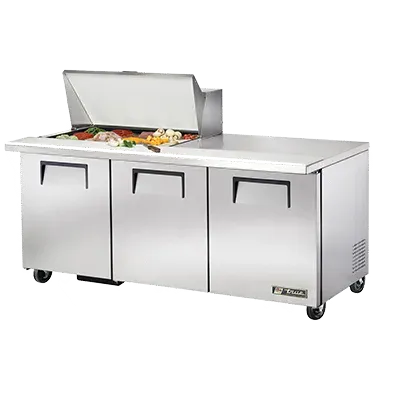 Craft culinary wonders with the True Manufacturing TSSU-72-15M-B-HC Refrigerated Counter, Mega Top Sandwich / Salad Unit. This top-of-the-line unit is designed to meet the demands of a busy commercial restaurant kitchen. With its spacious interior and (15) 1/6 size poly pans, you'll have plenty of room to store and organize your ingredients. The stainless steel insulated cover ensures that your food stays fresh and at the perfect temperature. The 8-7/8" cutting board provides a convenient workspace for preparing sandwiches and salads. The stainless steel construction of the top, front, and sides, along with the aluminum back, ensures durability and easy cleaning. The aluminum interior with a stainless steel floor is both hygienic and resistant to corrosion. With three full doors and six shelves, you'll have easy access to all your ingredients. The 5" castors make it easy to move the unit around your kitchen. Plus, with its energy-efficient design and R290 Hydrocarbon refrigerant, this unit is not only good for your business but also for the environment. Trust True Manufacturing for quality and reliability.