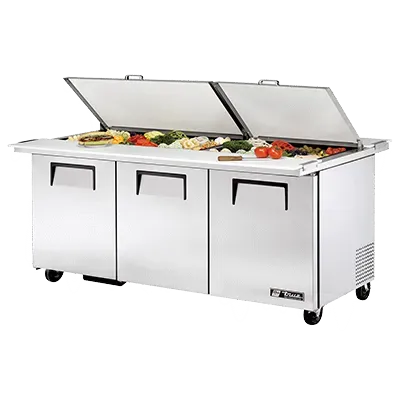 Culinary excellence in every dish starts with the True Manufacturing TSSU-72-30M-B-DS-ST-HC Refrigerated Counter. This mega top sandwich/salad unit is designed to meet the demands of a busy commercial restaurant kitchen. With its dual side configuration, it offers ample space for storing and organizing ingredients. The unit comes with 30 poly pans, each with a 4-inch depth, perfect for keeping your salad toppings and sandwich fillings fresh and easily accessible. The stainless steel insulated covers ensure optimal temperature retention, while the 11-3/4-inch cutting boards provide a convenient workspace for food preparation. Made in the USA, this unit features a durable stainless steel top, front, and sides, as well as an aluminum back for long-lasting performance. The aluminum interior with a stainless steel floor is easy to clean and maintain. Equipped with three full doors and six shelves, this unit offers plenty of storage options. The 5-inch castors make it easy to move the unit around the kitchen as needed. With its reliable 1/2 HP compressor and R290 Hydrocarbon refrigerant, this unit is energy-efficient and environmentally friendly. Trust True Manufacturing for a refrigerated counter that delivers exceptional performance and durability in a commercial restaurant setting.