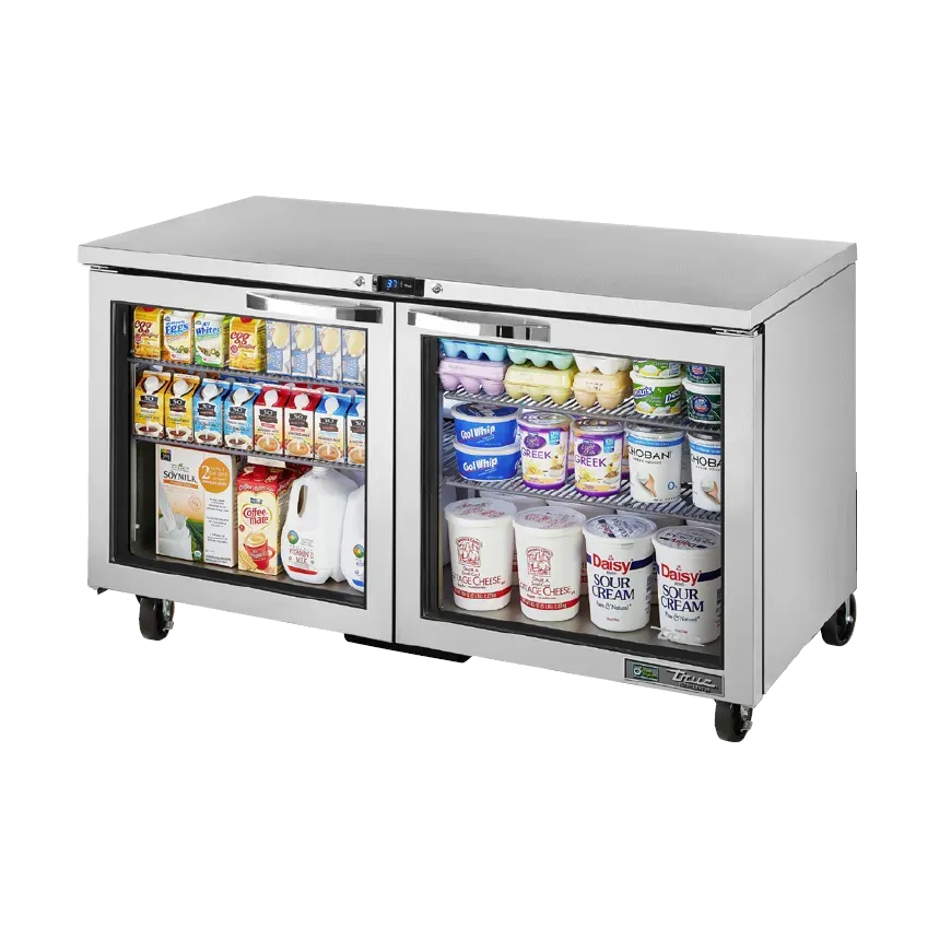 Ignite culinary passion with the True Manufacturing TUC-60G-HC~SPEC3 Undercounter Refrigerator. This top-of-the-line refrigerator is designed to meet the demanding needs of commercial restaurants. With its SPEC Package 3, it offers a range of features that make it a valuable addition to any kitchen. The 16-gauge stainless steel top, sides, and back ensure durability and easy cleaning, while the stainless steel interior provides a hygienic storage space. The two Low-E glass doors not only showcase your ingredients but also help to conserve energy. The electronic temperature control with a digital display allows for precise temperature management, ensuring your perishables stay fresh. With four shelves and a door lock, you can organize and secure your items with ease. The 5" castors make it effortless to move the refrigerator for cleaning or rearranging. Made in the USA and UL EPH Classified, this True Manufacturing undercounter refrigerator is a reliable and efficient choice for any commercial kitchen.