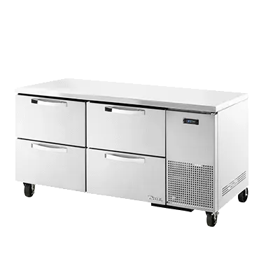 Elevate your cuisine with the True Manufacturing TUC-67D-4-HC~SPEC3 Refrigerator. This undercounter reach-in refrigerator is designed to meet the demands of a commercial restaurant setting. With its SPEC Package 3, it offers a 16-gauge stainless steel top, sides, and back, ensuring durability and easy cleaning. The stainless steel interior and four drawers provide ample storage space for your ingredients, while accommodating two 12" x 20" x 8" pans (not included). The electronic temperature control with a digital display allows you to easily monitor and adjust the temperature between 33 - 38F, ensuring your ingredients stay fresh. The 5" castors make it easy to move the refrigerator for cleaning or rearranging your kitchen layout. Made in the USA, this True Manufacturing refrigerator is UL EPH Classified and uses R290 Hydrocarbon refrigerant, making it both efficient and environmentally friendly. Upgrade your kitchen with this reliable and high-performing undercounter refrigerator.