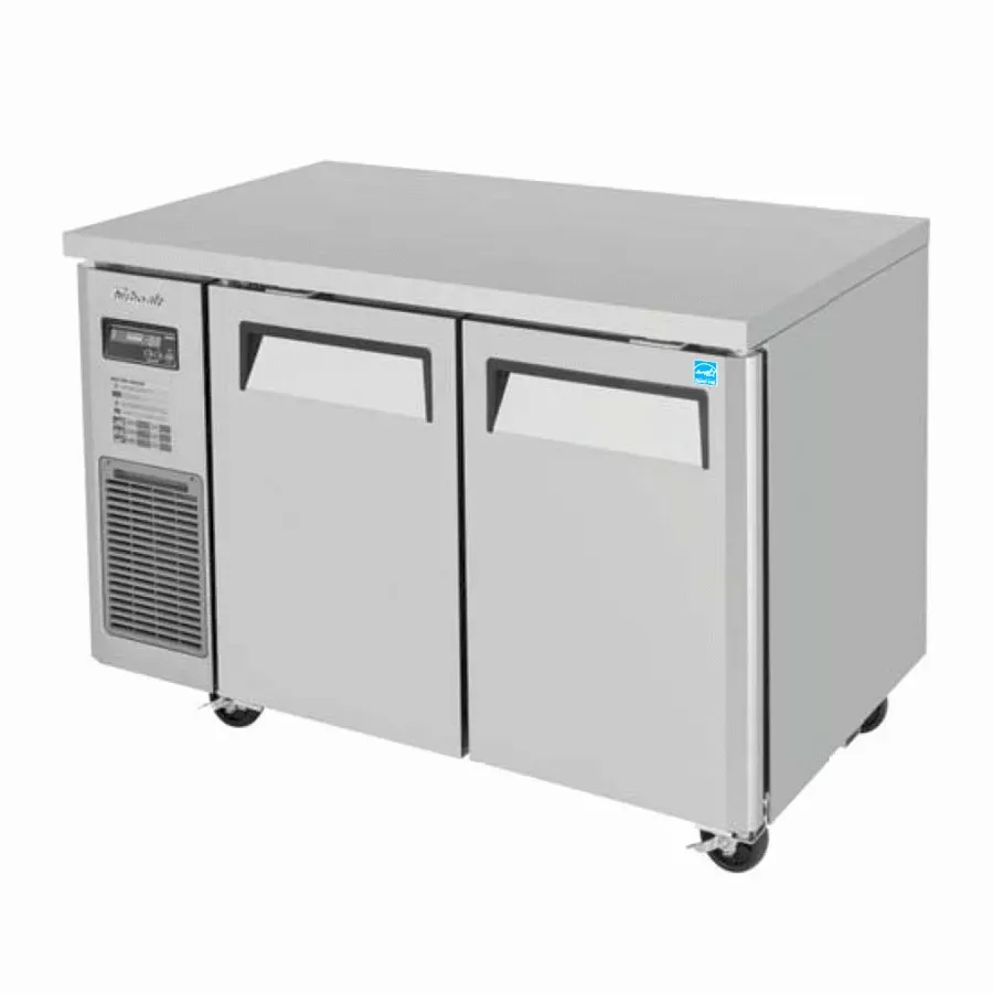 Master the art of cooking with the Turbo Air JUR-48-N6 Undercounter Reach-In Refrigerator. This two-section refrigerator is designed to meet the needs of commercial restaurants, offering a spacious 9.93 cu. ft. capacity to store all your ingredients and keep them fresh. The front breathing and side mount self-contained compressor ensure efficient cooling while saving valuable kitchen space. With two stainless steel doors featuring recessed handles, accessing your stored items is quick and convenient. The interior is equipped with two PE coated wire shelves and LED lighting for easy organization and visibility. The hot gas condensate system prevents water overflow, maintaining a clean and hygienic environment. Made with a stainless steel exterior and aluminum interior, this refrigerator is built to withstand the demands of a busy kitchen. With its ENERGY STAR certification, this Turbo Air refrigerator not only saves energy but also reduces utility costs. Elevate your culinary experience with the Turbo Air JUR-48-N6 Undercounter Reach-In Refrigerator.