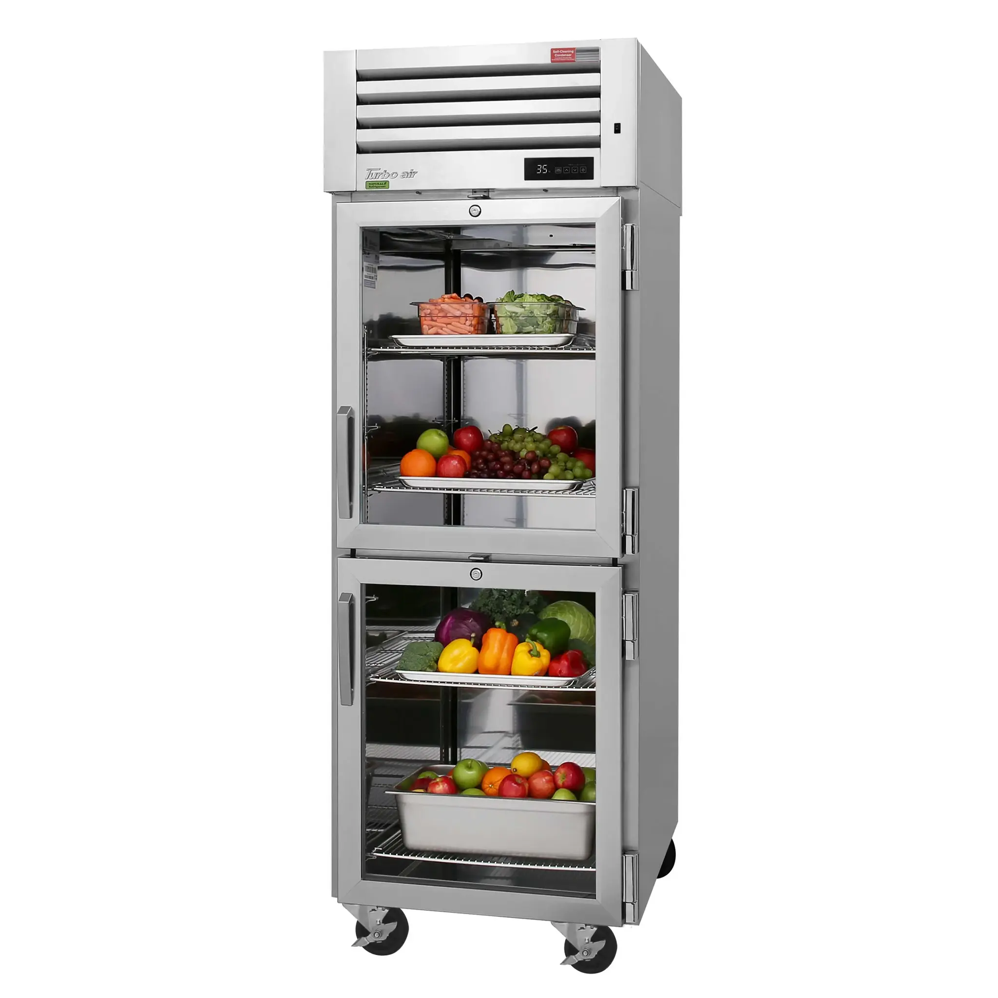 Craft culinary wonders with the Turbo Air PRO-26-2R-G-PT-N Pass-Thru Refrigerator. This top-of-the-line refrigerator is designed to meet the demands of a busy commercial restaurant. With a spacious 25 cu. ft. capacity and four glass half doors (two in the front and two in the rear) with locks, you can easily access and organize your ingredients while keeping them secure. The self-cleaning condenser device and hot gas condensate system ensure optimal performance and prevent dust buildup, while the digital temperature controller and self-diagnostic monitoring system allow for precise temperature control and easy maintenance. The LED interior lighting illuminates the stainless steel interior, making it easy to find what you need. With heavy-duty hinges and handles, this refrigerator is built to last. Made in the USA and backed by a lifetime guarantee, the Turbo Air PRO-26-2R-G-PT-N is the perfect addition to any commercial kitchen.