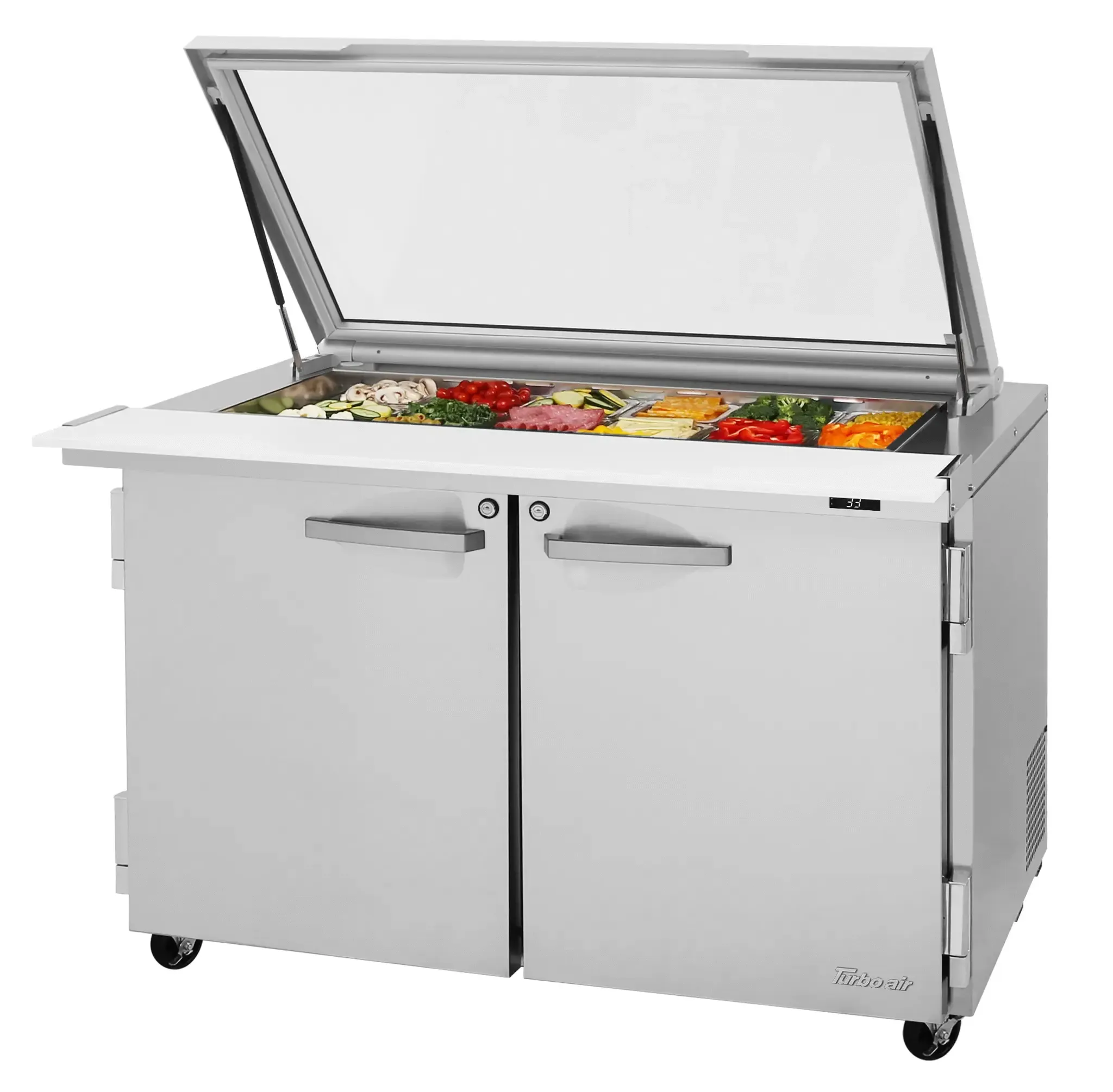Achieve kitchen supremacy with Turbo Air's PST-48-18-N-GL Prep Tables. Designed to meet the demands of a commercial restaurant, this prep table is a game-changer. With its sleek and durable construction, it is built to withstand the rigors of a busy kitchen. The PST-48-18-N-GL features a spacious worktop, measuring 48-1/4 x 35-3/4 inches, providing ample space for food preparation. Equipped with a plug type NEMA 5-15P, this prep table operates on a voltage of 115/60/1, making it compatible with most commercial kitchen setups. The unit is powered by 530 watts and consumes only 6.5 amperes, ensuring energy efficiency. The refrigerant used is 290, which guarantees optimal cooling performance. Turbo Air's PST-48-18-N-GL Prep Table is the perfect addition to any commercial kitchen, offering reliability, efficiency, and functionality.