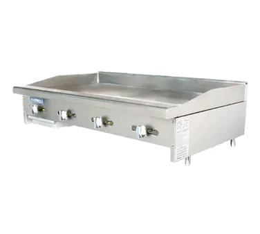 Optimize your kitchen efficiency with the Turbo Air TAMG-48 Gas Countertop Griddle. This high-quality griddle is designed to meet the demands of a commercial restaurant setting. With its stainless steel front and side, built-in splash guard, and highly polished steel griddle plate, this griddle is not only durable but also easy to clean. The TAMG-48 features four aluminized U-shaped burners and manual controls for every 12 inches, allowing for precise temperature control and even heat distribution. The individual heat-resistant on-off knobs make it easy to adjust the heat for each burner. The griddle also includes a 3-inch wide front grease trough and a removable grease pan for easy cleaning. With a total of 88,000 BTU, this griddle is powerful enough to handle any cooking task. Trust Turbo Air to provide you with a reliable and efficient griddle for your commercial kitchen.