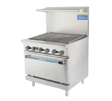 Achieve culinary excellence with the Turbo Air TAR-36RB-LP Range, a must-have for any commercial restaurant. This Radiance Heavy Duty Range is designed to deliver exceptional performance and durability. With its LP gas-powered radiant broiler top, you can easily achieve the perfect sear on your meats and vegetables. The thermostatically controlled reversible 3 bar cast iron radiant with grease runner ensures even heat distribution for consistent cooking results. The stainless steel front, sides, and back riser lift-off high shelf not only provide a sleek and professional appearance but also make cleaning a breeze. The stainless steel oven interior with a standard oven base and crumb tray ensures easy maintenance. The fully adjustable thermostat allows you to set the temperature from 250 F to 550 F, giving you precise control over your cooking. With a total of 122,000 BTU and 6" stainless steel legs, this range is built to handle the demands of a busy commercial kitchen. Trust Turbo Air for top-quality restaurant equipment.