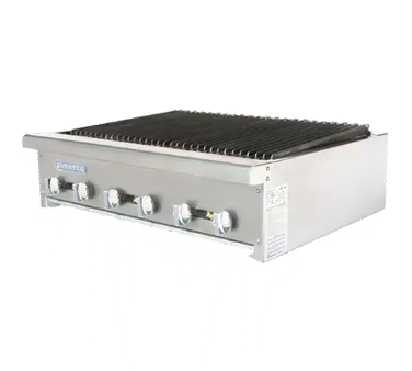 Ignite culinary passion with the Turbo Air TARB-36 Gas Countertop Charbroiler. This high-quality charbroiler is designed to meet the demands of a commercial restaurant kitchen. With its 16-gauge stainless steel front plate and wrap, it not only looks sleek but also ensures durability and longevity. The heavy-duty cast iron radiant and grates provide even heat distribution and excellent heat retention, allowing you to achieve perfect grill marks on your meats and vegetables. The six burners with manual controls give you precise control over the cooking temperature, while the removable grease pan makes cleaning a breeze. The bullnose stainless steel front extension adds a touch of elegance to your kitchen setup. With a total of 90,000 BTU, this charbroiler delivers powerful performance to meet the needs of a busy restaurant. Trust Turbo Air, a reputable vendor in the industry, to provide you with a reliable and efficient charbroiler for your commercial kitchen.