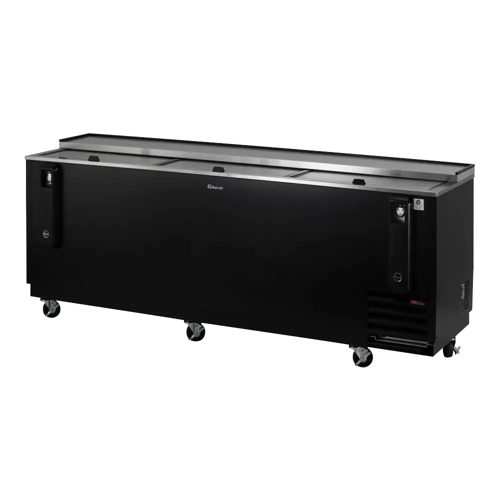Deliver food perfection with the Turbo Air TBC-95SB-N Bottle Cooler. This sleek and efficient cooler is designed to meet the demands of a busy commercial restaurant. With a spacious 30.3 cu.ft. capacity and six adjustable dividers, you can easily organize and store a large quantity of bottles. The self-cleaning condenser ensures optimal performance and reduces maintenance needs, while the built-on removable bottle cap opener and catcher add convenience to your beverage service. The three sliding lids provide easy access to the contents, and the stainless steel countertop and lid offer durability and a professional look. The black laminated exterior and stainless steel interior walls and floor not only enhance the cooler's aesthetics but also make it easy to clean. With a side mount compressor and front breathing design, this cooler can be seamlessly integrated into your restaurant's layout. The Turbo Air TBC-95SB-N Bottle Cooler is equipped with R290 Hydrocarbon refrigerant, ensuring energy efficiency and environmental friendliness. Trust Turbo Air to deliver the perfect cooling solution for your restaurant.