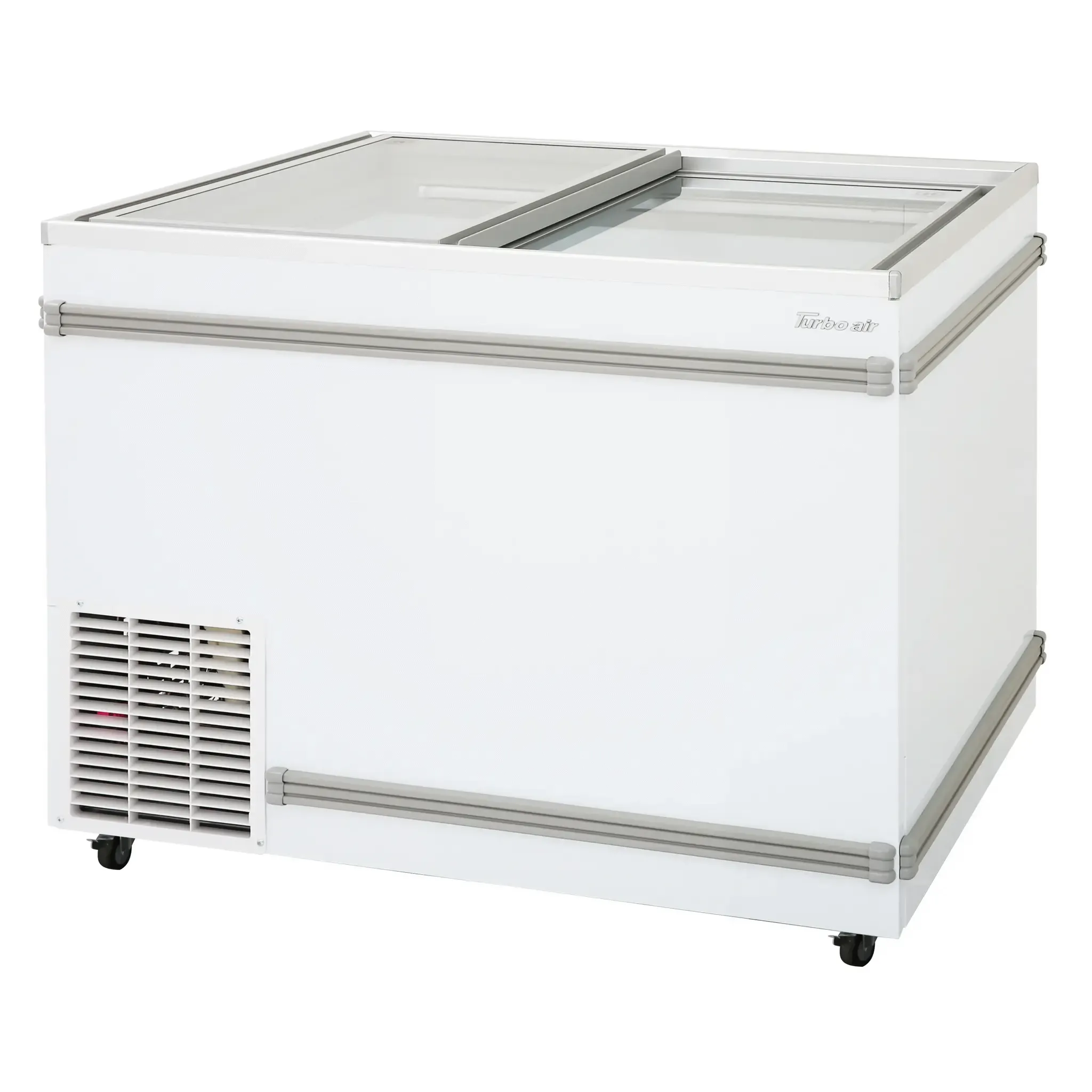 Mobilize your kitchen with the Turbo Air TFS-11F-N Chest Freezer. This top open island freezer is perfect for commercial restaurant use, offering a spacious 13.77 cu. ft. capacity to store all your frozen goods. The chest style design with a flat top allows for easy access and efficient organization. With two tempered sliding glass doors and fifteen wire baskets, you can easily see and retrieve your items. The LED interior lighting illuminates the freezer, making it easy to locate what you need. The digital temperature controls allow you to set the perfect temperature between -10F to 8F, ensuring your food stays fresh and frozen. The manual defrost with drain makes maintenance a breeze. The white steel interior and exterior are durable and easy to clean. With four casters, including two locking ones, you can easily move and secure the freezer wherever you need it. Trust Turbo Air for reliable and efficient refrigeration solutions in your commercial kitchen.