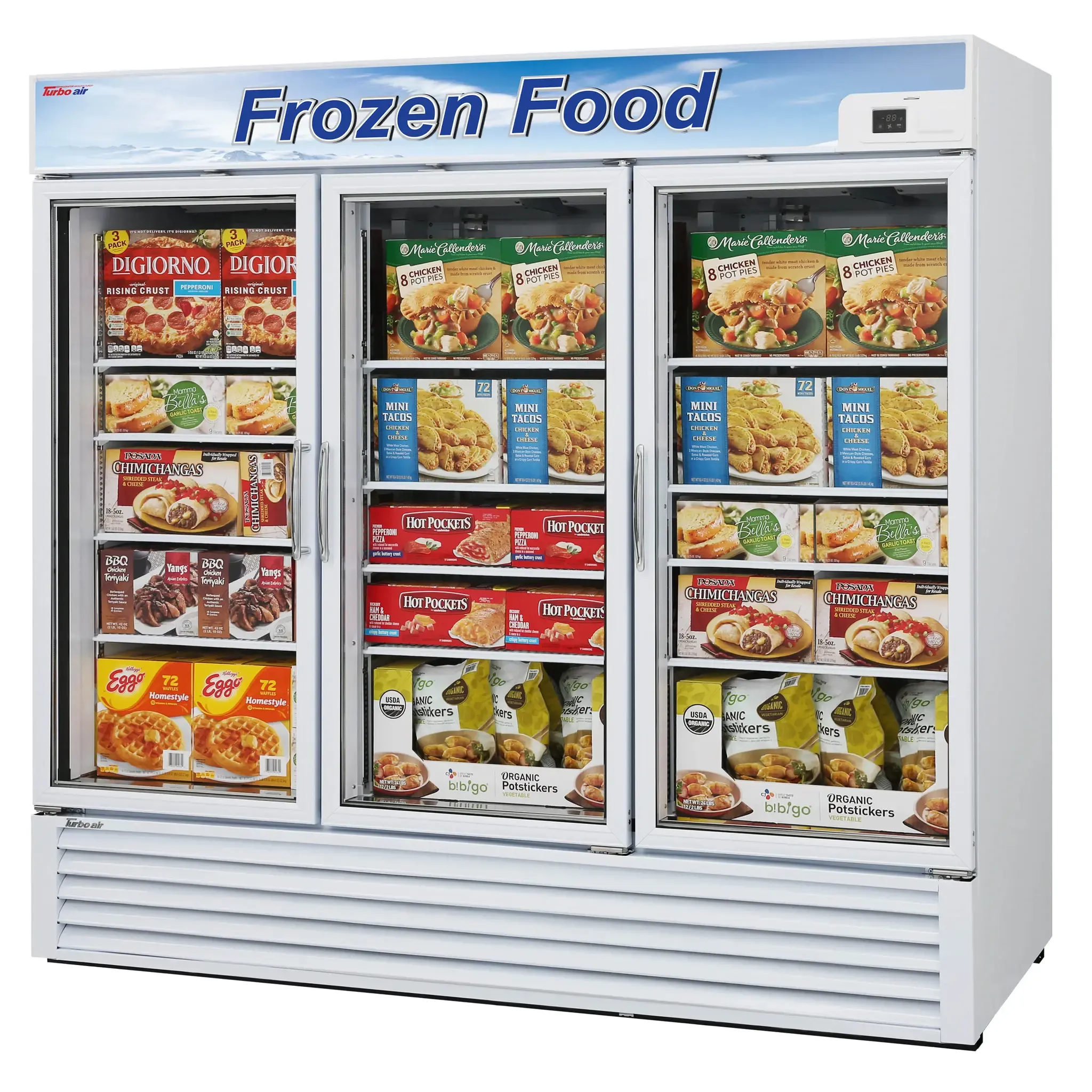 Cook with precision using the Turbo Air TGF-72F-N Freezer Merchandiser. This three-section freezer offers a spacious 58.45 cu. ft. capacity, making it perfect for commercial restaurant use. The triple pane heated glass doors not only provide a clear view of the contents but also help maintain the ideal temperature inside. With LED lighting and 12 adjustable PE coated wire shelves, organizing and accessing your frozen goods has never been easier. The digital temperature controller ensures precise temperature management, while the door opening alarm alerts you if the doors are left open, preventing any potential food spoilage. The self-diagnostic monitoring system and automatic fan motor delays further enhance the efficiency and longevity of the unit. The Turbo freezing and smart fuzzy defrosting features optimize performance and energy consumption. The LED sign panel allows for easy product advertising, attracting customers to your offerings. With a white exterior and bottom mount compressor, this freezer merchandiser is not only functional but also visually appealing. It operates on R290 Hydrocarbon refrigerant, which is environmentally friendly. Powered by two 2/3 HP motors, this freezer merchandiser is reliable and efficient. Invest in the Turbo Air TGF-72F-N Freezer Merchandiser for a top-of-the-line freezing solution that will elevate your commercial restaurant's operations.