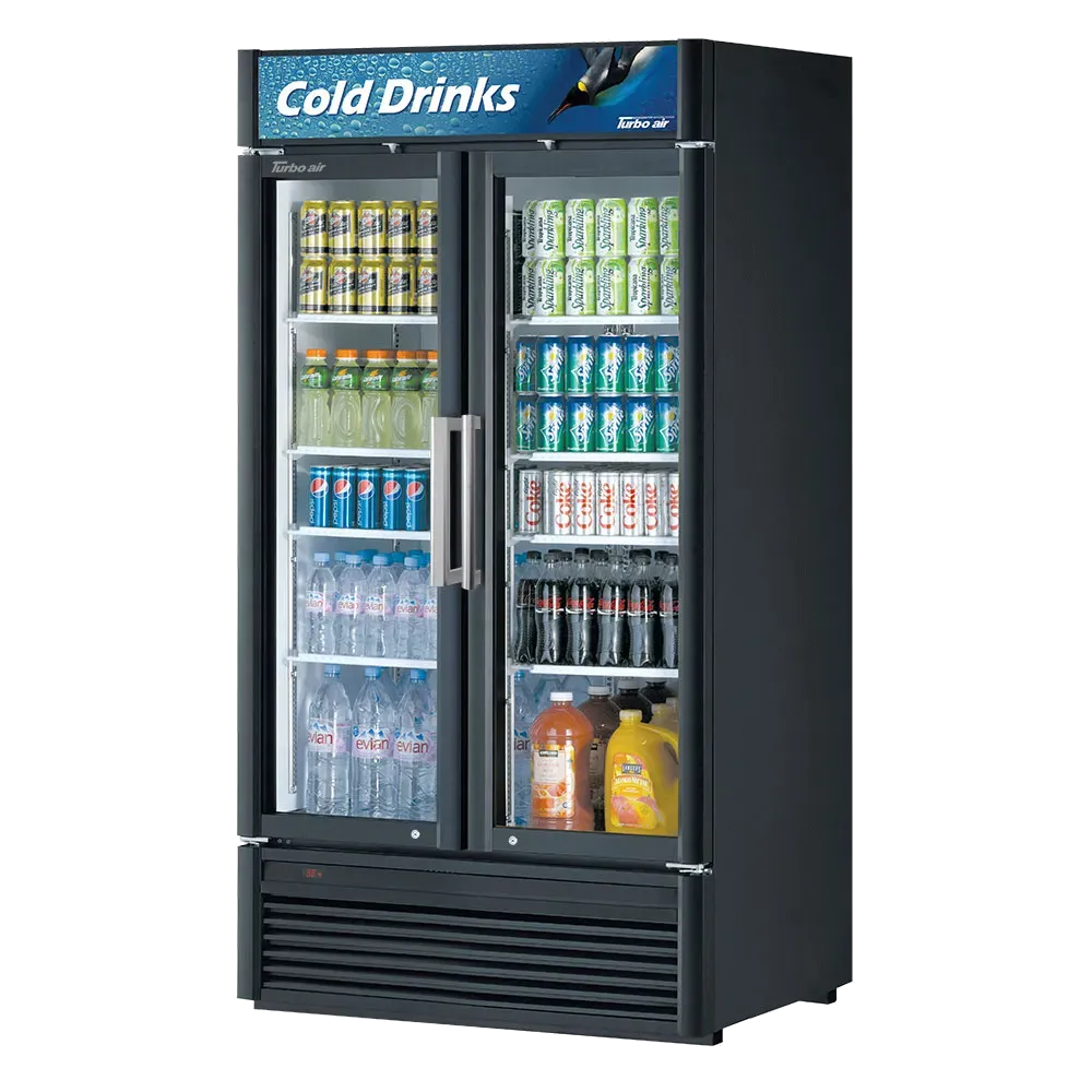 Cook with confidence with the Turbo Air TGM-35SD-N Refrigerator Merchandiser. This super deluxe glass merchandiser refrigerator is perfect for commercial restaurant use. With its two-section design and 29.06 cu. ft. capacity, you'll have plenty of space to store and display your products. The self-contained and self-cleaning condenser device ensures optimal performance and easy maintenance. The double pane Low-E glass doors come with locks for added security. The eight adjustable PE coated wire shelves allow for flexible storage options. The exterior digital thermometer and controller make it easy to monitor and adjust the temperature. Plus, the door opening alarm and self-diagnostic monitoring system provide peace of mind. The Turbo Air TGM-35SD-N also features an automatic fan motor delay, hot gas condensate system, and Turbo cooling for efficient operation. The LED interior lighting and shadow-free LED LGP advertising panel create an attractive display. With its white interior and customizable exterior cabinet color, this refrigerator merchandiser is both functional and visually appealing. The bottom mount compressor and R290 Hydrocarbon refrigerant ensure energy efficiency. Cook with confidence and showcase your products with the Turbo Air TGM-35SD-N Refrigerator Merchandiser.