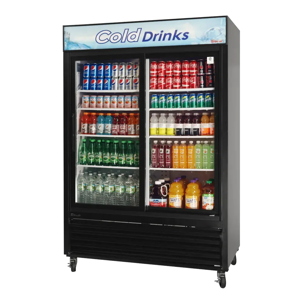 Enhance your commercial kitchen with the Turbo Air TGM-48RB-N Refrigerator Merchandiser. This two-section refrigerated merchandiser is perfect for showcasing your food and beverages in a stylish and efficient way. With a spacious 44.0 cu. ft. capacity, this self-contained unit features two double pane Low-E self-closing sliding glass doors, allowing easy access for customers while keeping the cold air inside. The LED interior and canopy lighting not only provide excellent visibility but also create an inviting atmosphere for your customers. The energy conserving fan control and hot gas condensate system ensure optimal performance and energy efficiency. With eight adjustable PE coated wire shelves, you can customize the layout to accommodate a variety of products. The black cabinet with black trim adds a sleek and modern touch to your establishment. The bottom mount compressor and R290 Hydrocarbon refrigerant contribute to the unit's energy-saving capabilities. This refrigerator merchandiser is also ENERGY STAR certified, guaranteeing its efficiency and sustainability. Trust Turbo Air, a reputable vendor in the industry, to provide you with a high-quality and reliable product.