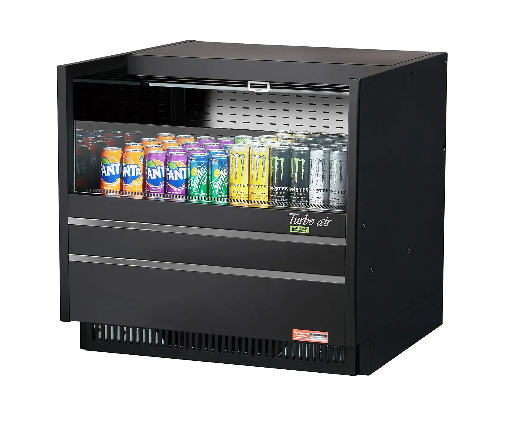 Upgrade your restaurant kitchen with the Turbo Air TOM-36UC-W(B)-N Open Display Case. This sleek and modern display case is designed to enhance impulsive sales, making it the perfect addition to any commercial restaurant. The low profile and solid side panel create a visually appealing display, while the stainless steel interior ensures durability and easy cleaning. The perforated interior back wall and open top improve airflow, keeping your products fresh and at the perfect temperature. With LED interior lighting and a solar-powered digital thermometer, you can easily monitor and showcase your products. The digital electronic thermostat with defrost control and energy-saving night curtain help to optimize energy efficiency. This open display case is equipped with self-cleaning condenser and hydrocarbon refrigerants, ensuring reliable performance and reducing maintenance needs. Upgrade your restaurant kitchen with the Turbo Air TOM-36UC-W(B)-N Open Display Case and attract customers with its stylish design and efficient functionality.