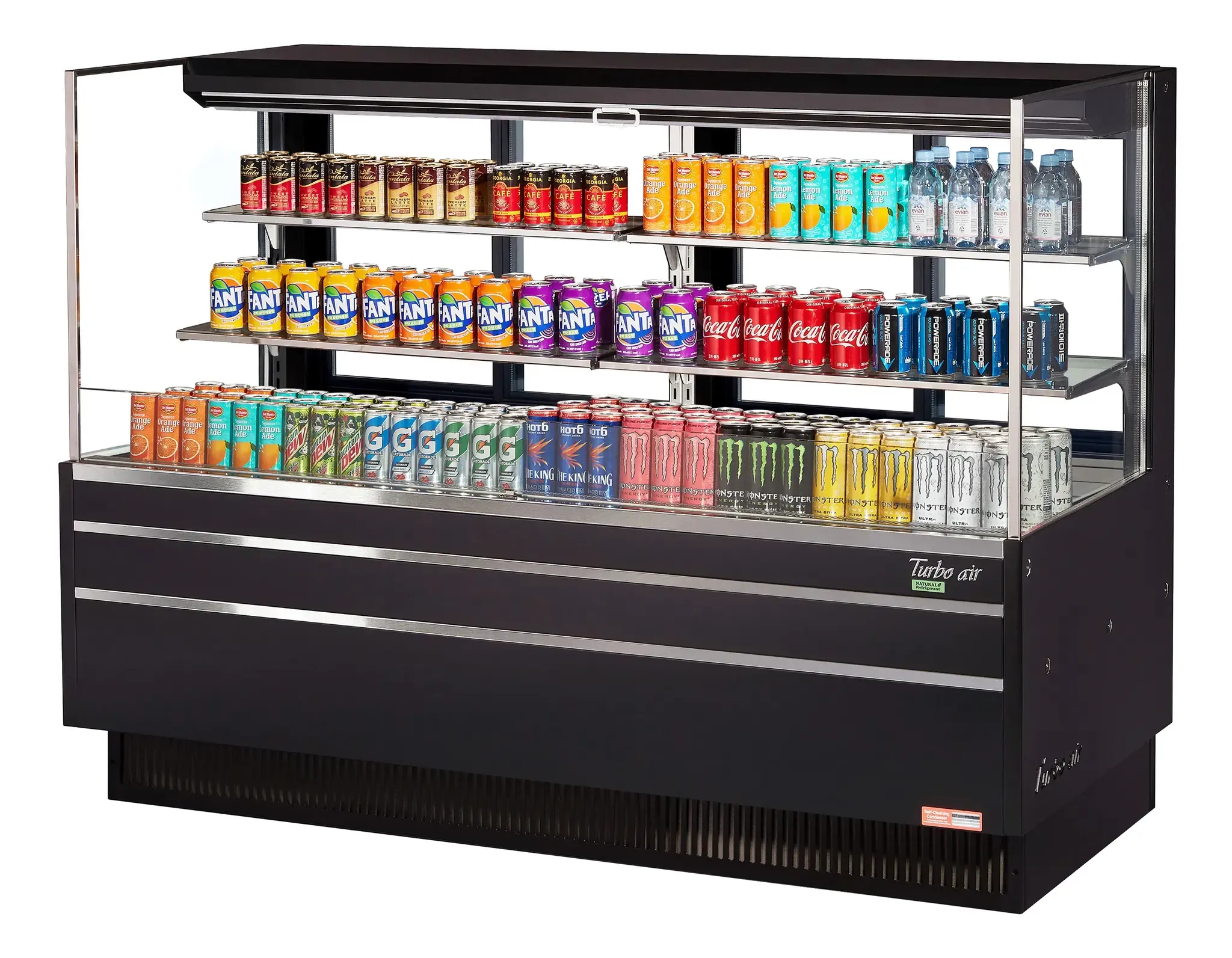 Elevate your culinary experience with Turbo Air's TOM-72L-UFD-W(B)-3S-N Open Display Case. This sleek and modern display case is designed to enhance impulse sales in a commercial restaurant setting. With its low profile and glass side panels, it offers a clear view of your delectable offerings, enticing customers to make a purchase. The self-cleaning condenser ensures optimal performance and efficiency, while the hydrocarbon refrigerants contribute to a more sustainable operation. The TOM-72L-UFD-W(B)-3S-N features a standard back-guard that improves airflow, keeping your products fresh and cool. It also comes with a bottom stainless steel solid shelf and two glass shelves, providing ample space for displaying a variety of items. The perforated glass doors and open top further enhance airflow, while the LED interior lighting beautifully showcases your products. Loading and unloading is made easy with the sliding rear door, and the energy-saving night curtain helps conserve energy during non-business hours. Available in white and black color options, this open display case is a must-have for any commercial restaurant looking to elevate its presentation and boost sales.