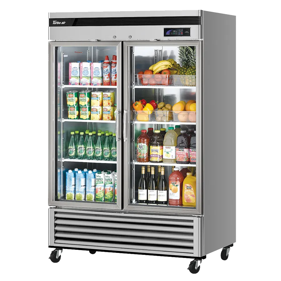 Boost your restaurant's performance with the Turbo Air TSR-49GSD-N Refrigerator Merchandiser. This super deluxe glass door refrigerator is designed to meet the demands of a busy commercial kitchen. With a spacious two-section design and a capacity of 44.14 cu. ft., it provides ample storage space for all your ingredients and beverages. The self-contained and self-cleaning condenser device ensures optimal performance and reduces maintenance needs. The front aluminum door frame and stainless steel construction make it durable and easy to clean. The hinged double pane glass doors with Low-E glass not only provide a clear view of the contents but also help to conserve energy. LED interior lighting illuminates the interior, making it easy to find what you need. The six PE coated wire shelves offer flexible storage options, and the LED digital thermometer allows for precise temperature control. With features like door open beep, self-diagnostic monitoring system, and turbo cooling, this refrigerator merchandiser ensures food safety and efficiency. The automatic fan motor delays and door locks add an extra layer of convenience and security. The bottom mount compressor and R290 Hydrocarbon refrigerant ensure energy efficiency and environmental friendliness. This refrigerator merchandiser operates on 1/3 HP and 115v/60/1-ph, making it suitable for most commercial kitchens. It is also ENERGY STAR certified, guaranteeing energy savings and sustainability. Trust Turbo Air, a reputable vendor in the industry, to provide you with a high-quality and reliable refrigeration solution.