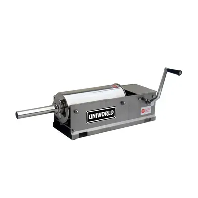 Facilitate easy access with the Uniworld Foodservice Equipment, SH-3, Sausage Stuffer, Manual. This deluxe sausage stuffer is designed to meet the demands of commercial restaurant use. With a 5-pound capacity and a horizontal portable design, it allows for efficient and convenient sausage stuffing. The stainless steel cylinder and base plate ensure durability and easy cleaning, while the 2-gear system provides smooth operation. The all stainless steel construction guarantees long-lasting performance, even in high-volume settings. Included with the stuffer are four stainless steel stuffing tubes, offering versatility in sausage sizes. Whether you're a small bistro or a bustling diner, this sausage stuffer is a must-have tool for creating delicious sausages in-house. Trust Uniworld Foodservice Equipment for reliable and efficient food preparation equipment. Upgrade your restaurant's sausage-making capabilities with the SH-3 Sausage Stuffer.