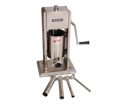 Enhance accessibility and ease with the Uniworld Foodservice Equipment, USSC-DL3, Sausage Stuffer, Manual. This deluxe sausage stuffer is designed to meet the demands of commercial restaurant use. With a 5-pound capacity and a vertical, portable design, it allows for efficient and convenient sausage stuffing. The stainless steel cylinder and base plate ensure durability and easy cleaning, making it perfect for busy kitchens. The 2-gear system provides precise control and consistent results, while the four stainless steel tubes (standard) offer versatility in sausage sizes. Whether you're making bratwurst, Italian sausage, or chorizo, this sausage stuffer is a reliable and efficient tool. Upgrade your restaurant's sausage-making process with the Uniworld Foodservice Equipment, USSC-DL3, Sausage Stuffer, Manual.