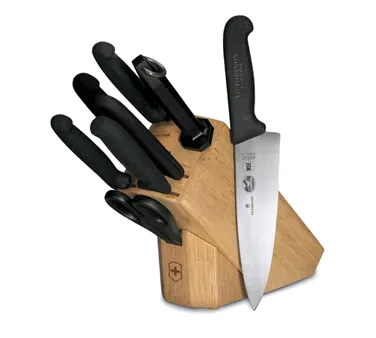 Transform Your Restaurant's Culinary Performance with the Victorinox Swiss Army, 5.1193.8-X2 Knife Set. This 8-piece block set is a must-have for any commercial restaurant. Crafted by Victorinox Swiss Army, a trusted name in cutlery, this set includes essential knives for every task. The 4" paring knife is perfect for precision work, while the 6" boning knife ensures clean cuts. The 8" chef's knife and bread knife handle all your slicing and dicing needs, while the 10" slicer effortlessly carves through meats. Keep your knives sharp with the included 10" steel, and tackle any kitchen task with the versatile kitchen shears. The #41499 slant oak block provides safe and convenient storage for your knives. With NSF certification, you can trust the quality and hygiene of this set. Upgrade your restaurant's kitchen with the Victorinox Swiss Army Knife Set and experience the difference in performance and efficiency.