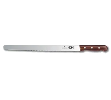 Culinary Perfection Made Simple with the Victorinox Swiss Army, 5.4230.36, Knife, Slicer. This professional-grade slicer knife is a must-have for any commercial restaurant. With its 14" serrated blade and 1-1/4" width at the handle, it effortlessly slices through meats, breads, and more, ensuring precision and consistency in every cut. The rosewood handle not only adds a touch of elegance but also provides a comfortable grip, reducing fatigue during long hours of use. Designed by Victorinox Swiss Army, a trusted name in cutlery, this knife is built to last and withstand the demands of a busy kitchen. Whether you're slicing roast beef for sandwiches or creating delicate garnishes, this slicer knife delivers exceptional performance. Elevate your culinary creations with the Victorinox Swiss Army, 5.4230.36, Knife, Slicer.