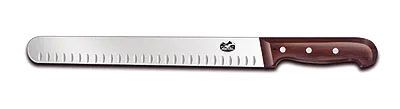 Unlock Culinary Creativity with the Victorinox Swiss Army, 7.6059.12 Slicer Knife. This professional-grade knife is a must-have for any commercial restaurant. With its 14" granton edge blade, it effortlessly slices through meats, fruits, and vegetables, ensuring precision and efficiency in every cut. The hollowed-out grooves on the side of the blade prevent food from sticking, allowing for smooth and uninterrupted slicing. The rosewood handle provides a comfortable grip, ensuring safety and control during use. Designed by Victorinox Swiss Army, a trusted name in cutlery, this knife is built to withstand the demands of a busy kitchen. Whether you're a chef or a culinary enthusiast, this slicer knife will elevate your cooking experience and help you create stunning dishes. Invest in the Victorinox Swiss Army, 7.6059.12 Slicer Knife and unlock a world of culinary possibilities.