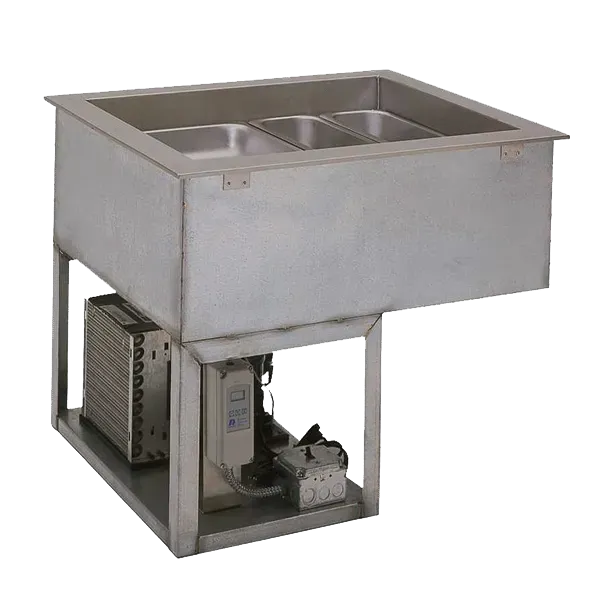 Wells RCP-7500 Refrigerated Drop-In Cold Pans hold pre-chilled food products at cold, fresh, and safe serving temperatures and pans are recessed 3" to comply with NSF-7 Performance requirements. Unit is completely self-contained with individual thermostatic controls, use R-513A CFC free refrigerant system featuring sight glass, and include an 8 ft. cord and plug. One-piece top flange and coved-corner interiors constructed of stainless steel. Exterior body constructed of heavy gauge, corrosion resistant steel. Condensing unit mounted on corrosion resistant frame below the cold pan. Featuring wrapped coil construction on both sides and bottom, on/off switch, easy service valves, dryer/filter and receiver. Condensing unit may be easily removed for service. 1" drain, Five 12" x 20" pans.