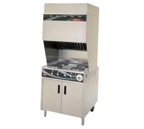 Wells WV-4HF Universal hood VCS 2000 Ventless Cooking System is Certified Type-1 compliant, UL710B approved recirculation hood system and feature completely self-contained 4-stage air filtration and fire-suppression systems integrated with hood and cooking equipment in one, ready to use package. It does not require venting outside making it possible to cook in nontraditional locations or when traditional Type-1 hoods and ductwork are impractical, restricted, or too expensive. Completely self-contained ANSULĀ® R-102 system, quiet 68 dBA average, illuminated early-warning system to monitor filter replacement, stainless-steel construction, and Fits through 36" wide door opening are just a few features. 2-door cabinet base, top - (4) French hot plates, 3-phase, 208/240V