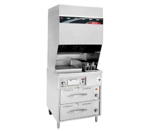 Wells WV-FG VCS 2000 Ventless Cooking System Universal Hoods is Certified Type-1 compliant, UL710B approved recirculation hood system and feature completely self-contained 4-stage air filtration and fire-suppression systems integrated with hood and cooking equipment in one, ready to use package. It does not require venting outside making it possible to cook in nontraditional locations or when traditional Type-1 hoods and ductwork are impractical, restricted, or too expensive. Completely self-contained ANSULĀ® R-102 system, includes a stainless-steel cabinet base for storage, fits through a 36" wide door opening, airflow sensors, and are movable, making them ideal for leased spaces. 2-door cabinet base, top - (1) fryer 15 lb, 1-phase, 208V