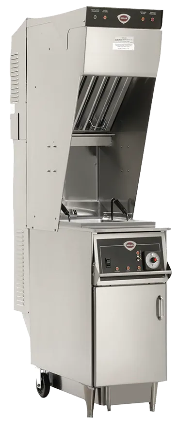 Wells WVAE-55FC Ventless Fryer with Auto-Lift VCS 2000 Ventless Cooking System is Certified Type-1 compliant, UL710B approved recirculation hood system and feature completely self-contained 3-stage air filtration and fire-suppression systems integrated with hood and cooking equipment in one, ready to use package. It does not require venting outside making it possible to cook in nontraditional locations or when traditional Type-1 hoods and ductwork are impractical, restricted, or too expensive. Completely self-contained ANSULĀ® R-102 system, automatic basket lift-cradle raises basket at the end of the cooking cycle, stainless-steel construction, fits through a 36" wide door opening, repeat-cycle timer activates using one push button operation, rectangular stainless-steel fry pot, automatic oil temperature control, and an additional fusible ink on the fry pot for added fire protection. 55 lb oil capacity fryer w/ Solid State controls, 1-phase, 208V