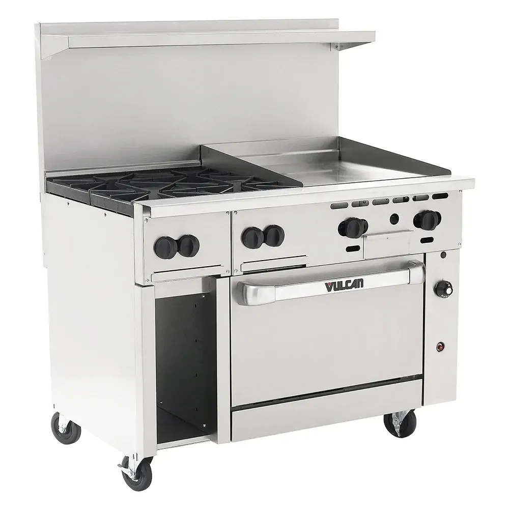 Elevate your culinary creations with the Challenger XL Restaurant Range, a pinnacle of performance and durability tailored for bustling kitchens. This 48-inch gas-powered marvel boasts four robust 30,000 BTU burners, each featuring lift-off burner heads for effortless maintenance and optimal heat distribution. Complementing the burners is a versatile 24-inch griddle, crafted with a 7/8-inch thick plate to ensure even cooking, making it perfect for everything from breakfast staples to gourmet entrees. The manual controls provide precise command over your cooking environment, while the 4-inch wide front grease trough ensures easy cleanup, maintaining the pristine condition of your kitchen. The standard oven offers consistent baking results, supported by a fully welded body that promises long-lasting resilience. Wrapped in sleek stainless steel, from the front and sides to the back riser and high shelf, this range exudes professionalism and style. Supported by 6-inch adjustable legs, it fits seamlessly into any kitchen layout, providing stability and convenience. With a powerful 195,000 BTU output and certifications from CSA Flame, CSA Star, and NSF, the Challenger XL Restaurant Range is not just a piece of equipment-it's a cornerstone of quality and efficiency, ready to meet the demands of your culinary artistry.