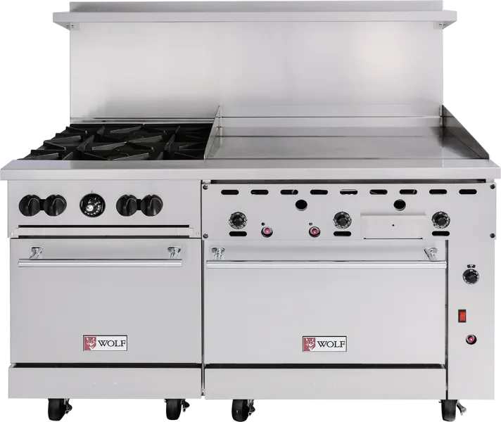 Elevate your culinary creations with the Challenger XL Restaurant Range, the ultimate powerhouse for professional kitchens. This 72-inch gas range is engineered to meet the rigorous demands of high-volume cooking. Featuring six high-efficiency 30,000 BTU burners with convenient lift-off heads, it offers unmatched versatility and precision for simmering sauces and searing meats. The expansive 36-inch griddle with thermostatic controls ensures consistent, even heating for perfect pancakes, sizzling bacon, and much more. Dual convection ovens provide superior baking and roasting capabilities, delivering evenly cooked dishes every time. Designed with a sleek stainless steel front, sides, back riser, and high shelf, this range not only performs but also enhances the aesthetic of any kitchen. Its fully welded body and adjustable 6-inch legs ensure durability and stability, making it a reliable centerpiece for any culinary establishment. With a total of 310,000 BTUs, this gas range promises powerful performance while meeting CSA and NSF standards for safety and quality. Whether you're running a bustling diner or a gourmet restaurant, the Challenger XL Restaurant Range is your key to efficiency and excellence in the kitchen.